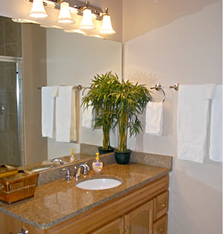 Australian cypress hardwood floors throughout the living room, dining room and hallway. Granite countertops in the kitchen and both bathrooms.